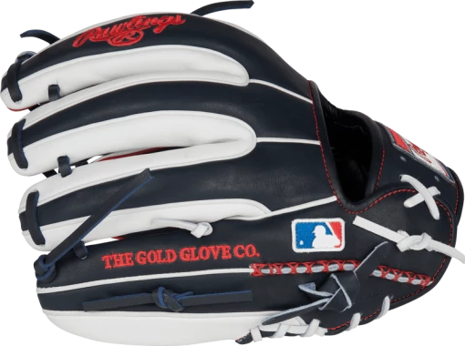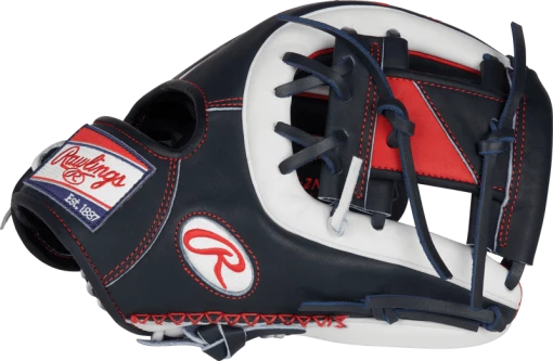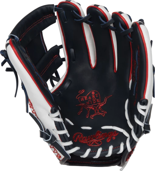Add some style to your game with the Heart of the Hide ColorSync 5.0 11.5-inch I-web glove. It was meticulously crafted from ultra-premium steer-hide leather, and features a unique eye-catching navy, white, and red design. In addition, it was also constructed with deer-tanned cowhide, thermoformed wrist lining, a padded thumb sleeve, and hand-sewn welting to give you unmatched comfort and feel too. And it’s all tied together by the extremely rare red, white, and blue Rawlings ColorSync patch.